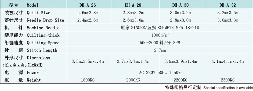 DH-A系列電腦高速絎縫機(jī)是制作各種床被、墊罩的縫制設(shè)備,縫制效率快、花樣美觀、圖形精細(xì)。該產(chǎn)品結(jié)構(gòu)采用橫梁運(yùn)動(dòng)方式,縫制時(shí)被巷物不運(yùn)動(dòng),具有較小的占地面積,可節(jié)省40%的使用空間。